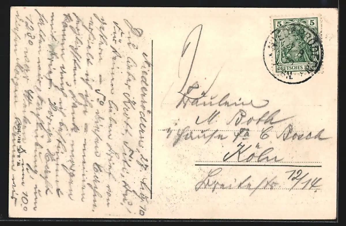 Personenbezogene Daten auf der Rückseite der Karte wurden durch blauen Textmarker unkenntlich gemacht. Die blauen Stellen sind auf die Vorderseite durchgeweicht und wirken sich negativ auf das Postkartenfoto aus