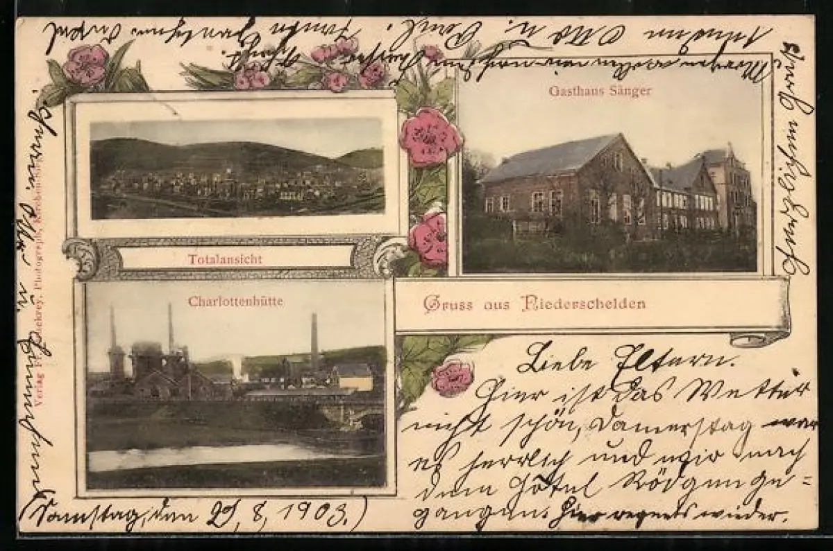 AK Niederschelden, Gasthaus Sänger, Totalansicht und Charlottenhütte