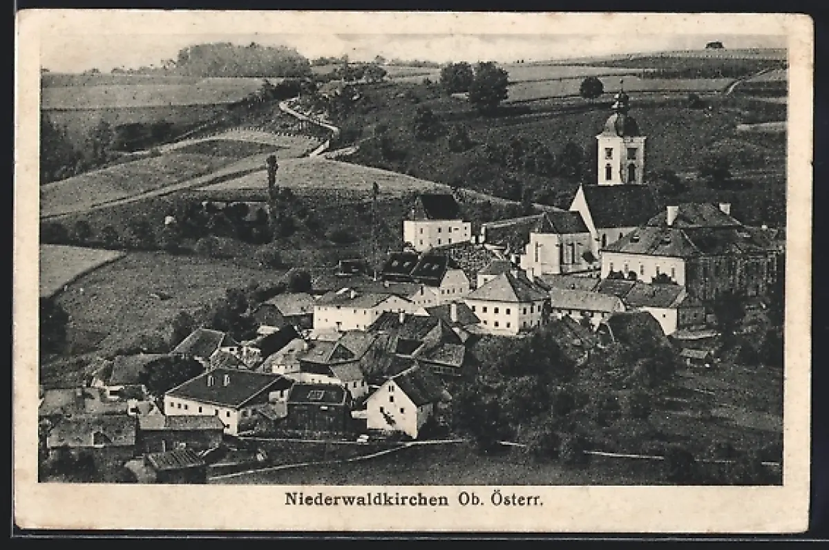 AK Niederwaldkirchen /Ob. Österr., Ortsansicht mit Kirche aus der Vogelschau