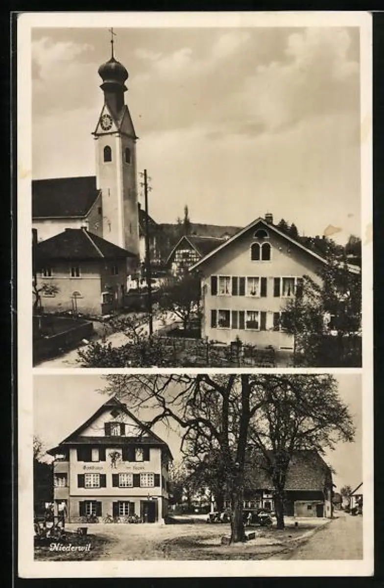 AK Niederwil /AG, Gasthaus zum Kreuz mit Platz u. Strasse, Teilansicht mit Kirche