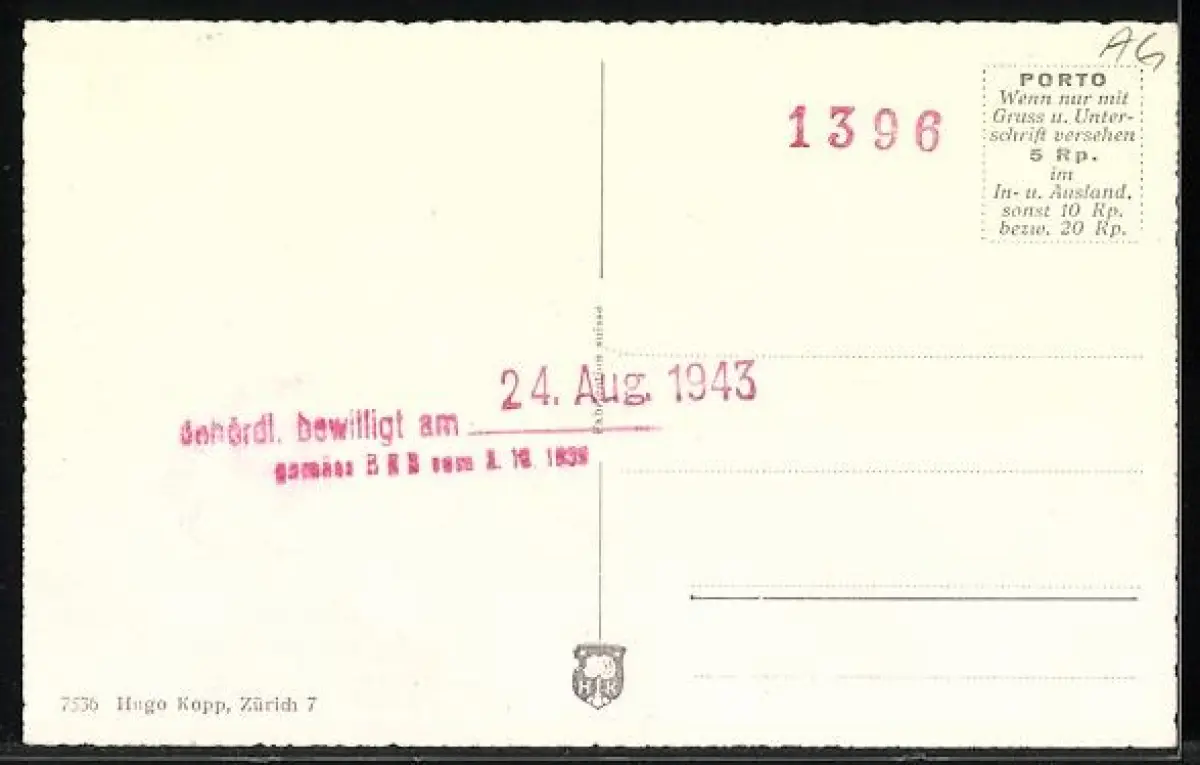 Personenbezogene Daten auf der Rückseite der Karte wurden durch blauen Textmarker unkenntlich gemacht. Die blauen Stellen sind auf die Vorderseite durchgeweicht und wirken sich negativ auf das Postkartenfoto aus