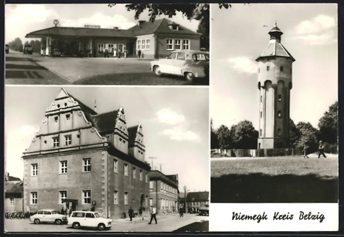 AK Niemegk /Belzig, Tankstelle, Rathaus, Wasserturm