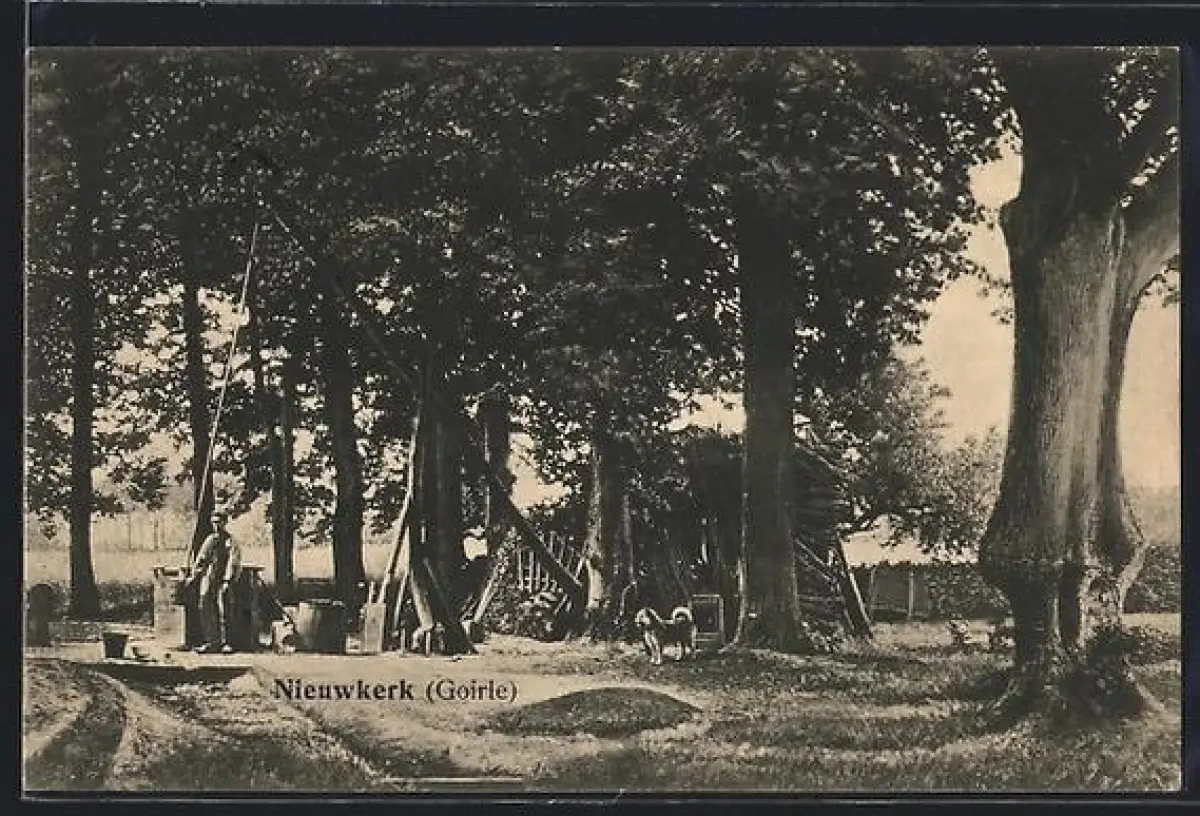 AK Nieuwkerk Goirle, Mann an einem Brunnen, Hund