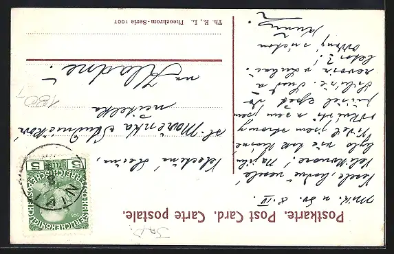 Personenbezogene Daten auf der Rückseite der Karte wurden durch blauen Textmarker unkenntlich gemacht. Die blauen Stellen sind auf die Vorderseite durchgeweicht und wirken sich negativ auf das Postkartenfoto aus