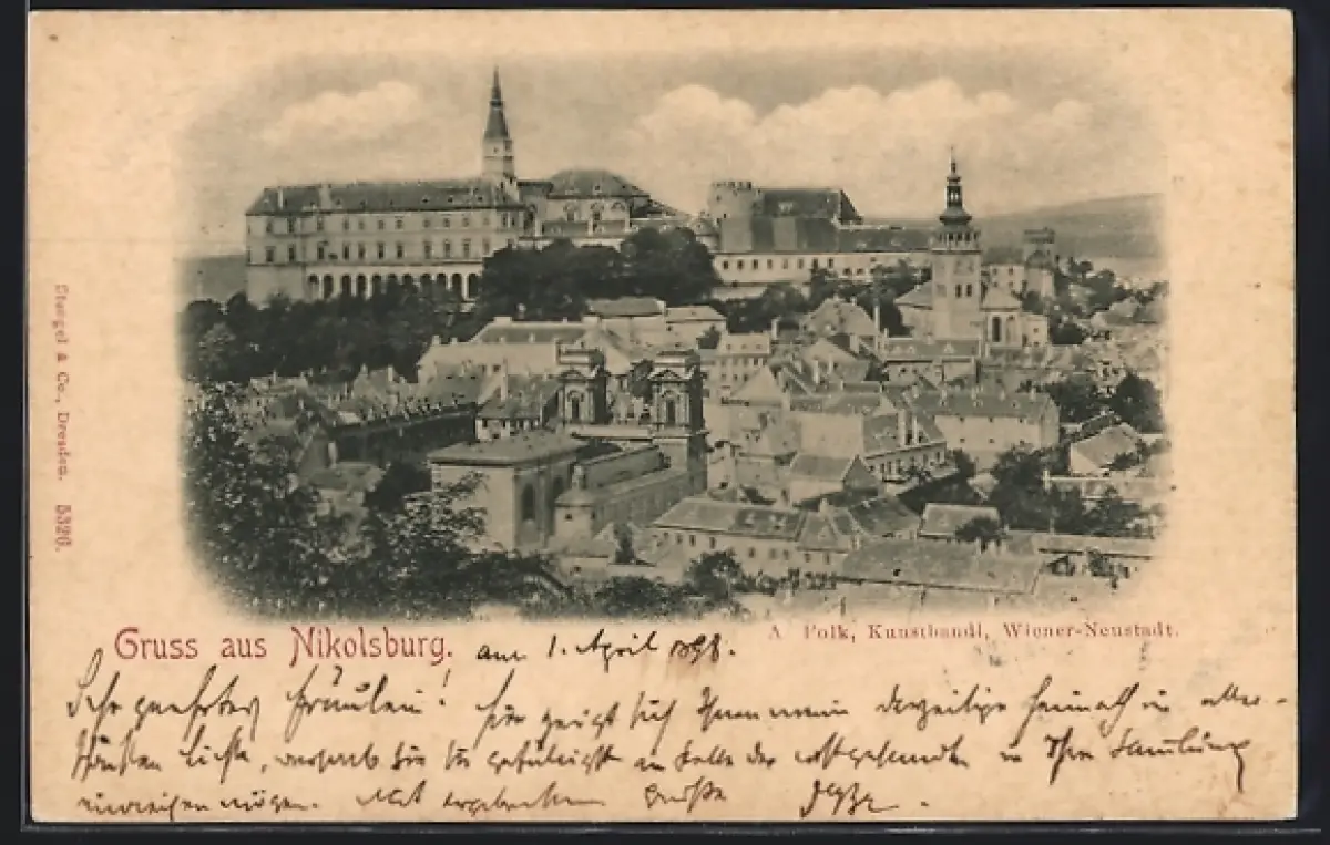 AK Nikolsburg, Totalansicht aus der Vogelschau, mit Burg