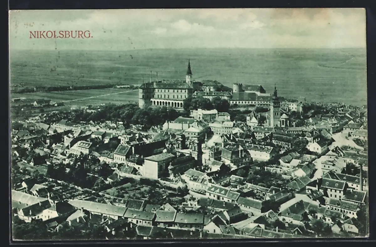AK Nikolsburg, Totalansicht mit Burg, von oben gesehen