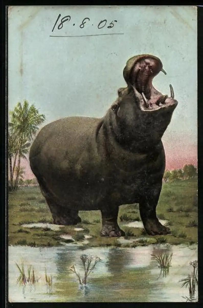 AK Nilpferd mit aufgerissenem Maul, Flusspferd