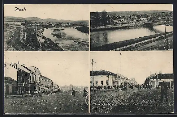 AK Nisch, Blick auf den Ort, Teilansicht mit Brücke, Strassenansichten