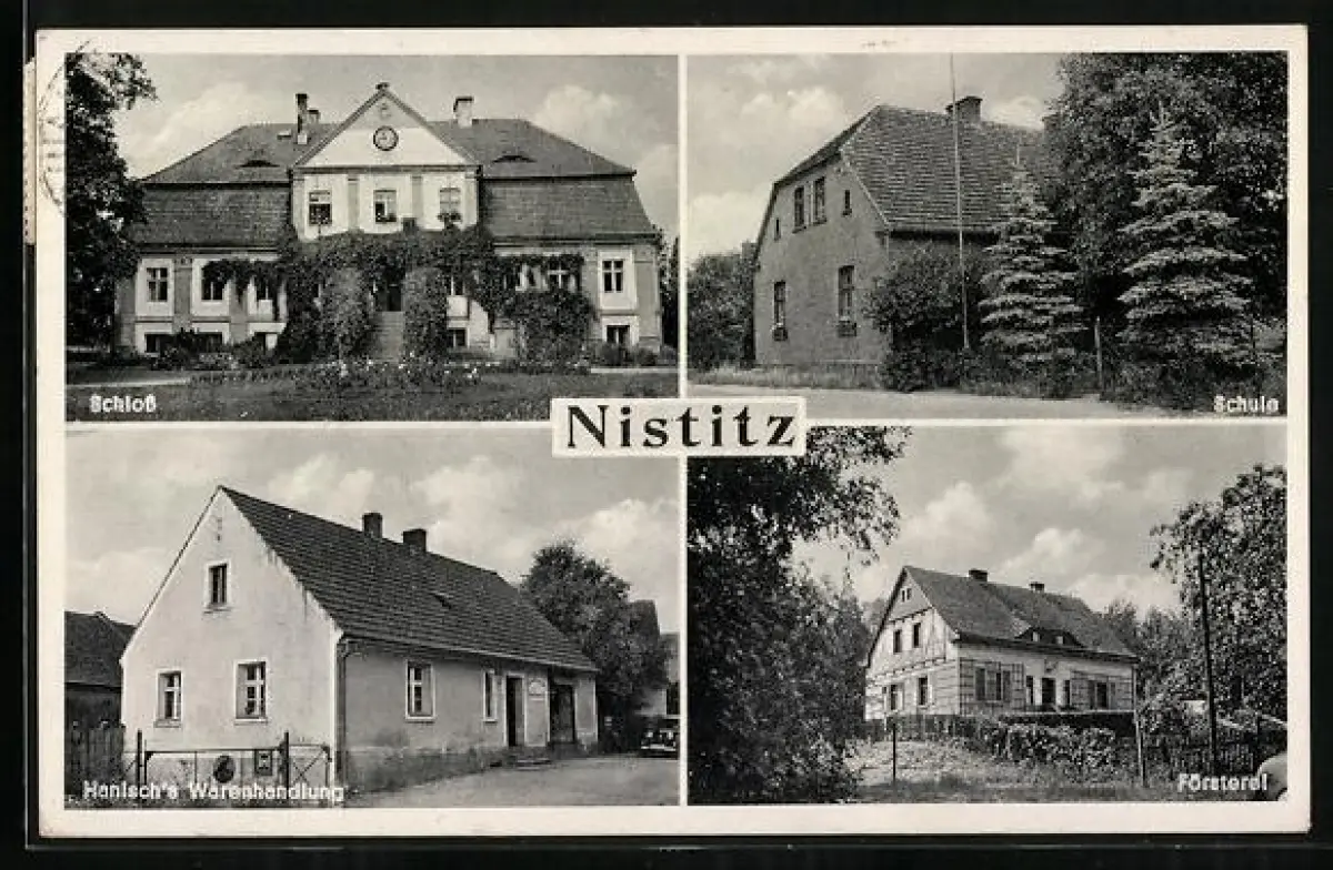AK Nistitz, Hanisch`s Geschäft, Försterei, Schule und Schloss