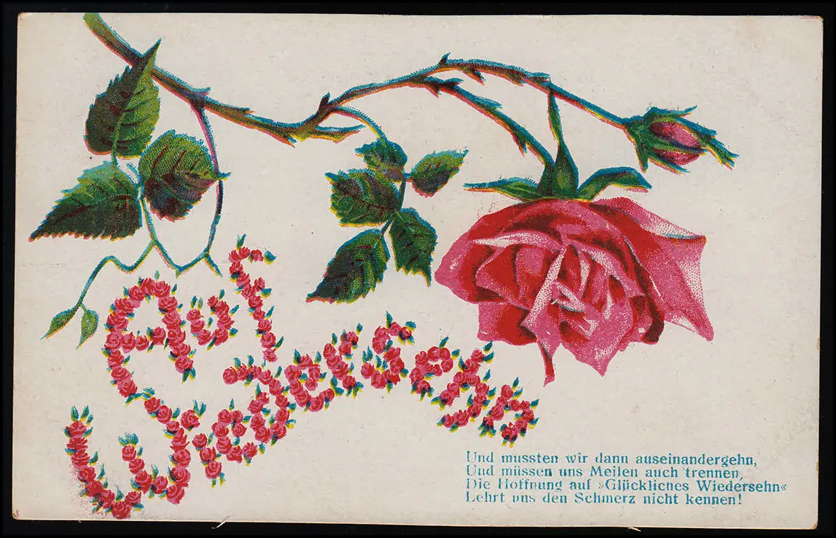 "Und mussten wir dann auseinandergehn, Und müssen uns Meilen auch trennen, Die Hoffnung auf "Glückliches Wiedersehn" Lehrt uns den Schmerz nicht kennen!"