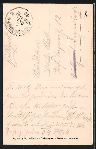 Personenbezogene Daten auf der Rückseite der Karte wurden durch blauen Textmarker unkenntlich gemacht. Die blauen Stellen sind auf die Vorderseite durchgeweicht und wirken sich negativ auf das Postkartenfoto aus
