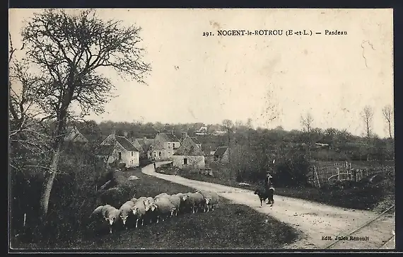 AK Nogent-le-Rotrou, Pasteur menant un troupeau de moutons sur une route de campagne