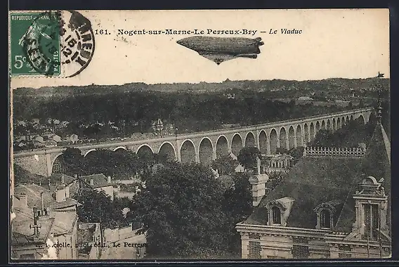 AK Nogent-sur-Marne-Le Perreux-Bry, Viadukt mit Zeppelin-Luftschiff