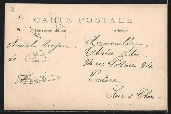 Personenbezogene Daten auf der Rückseite der Karte wurden durch blauen Textmarker unkenntlich gemacht. Die blauen Stellen sind auf die Vorderseite durchgeweicht und wirken sich negativ auf das Postkartenfoto aus