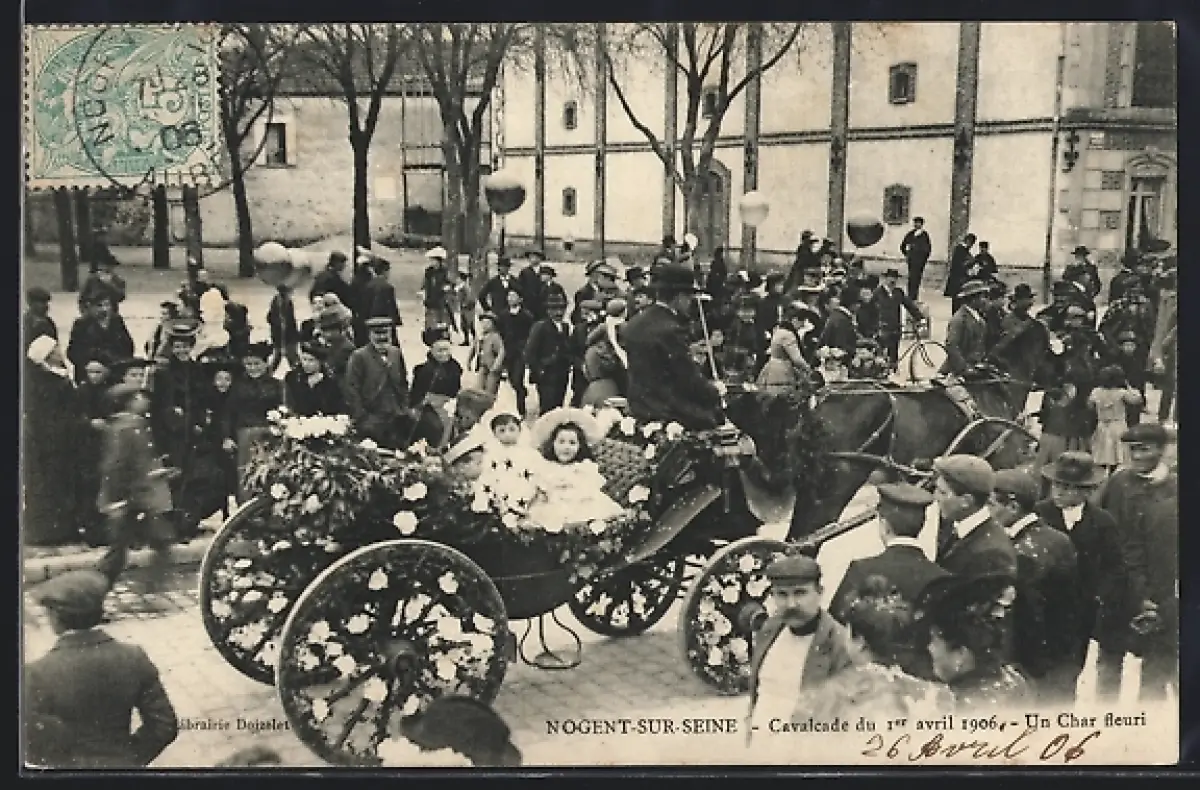 AK Nogent-sur-Seine, Cavalcade du 1er avril 1906, Un char fleuri