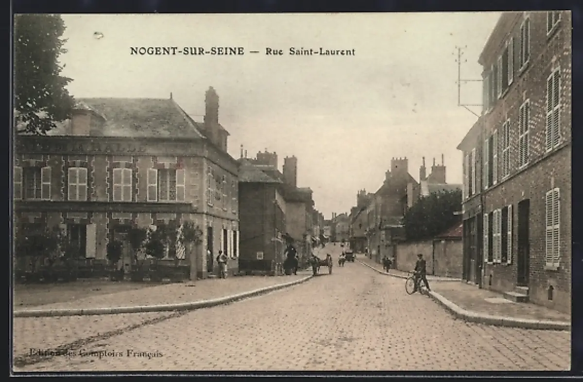 AK Nogent-sur-Seine, Rue Saint-Laurent avec cycliste et calèche