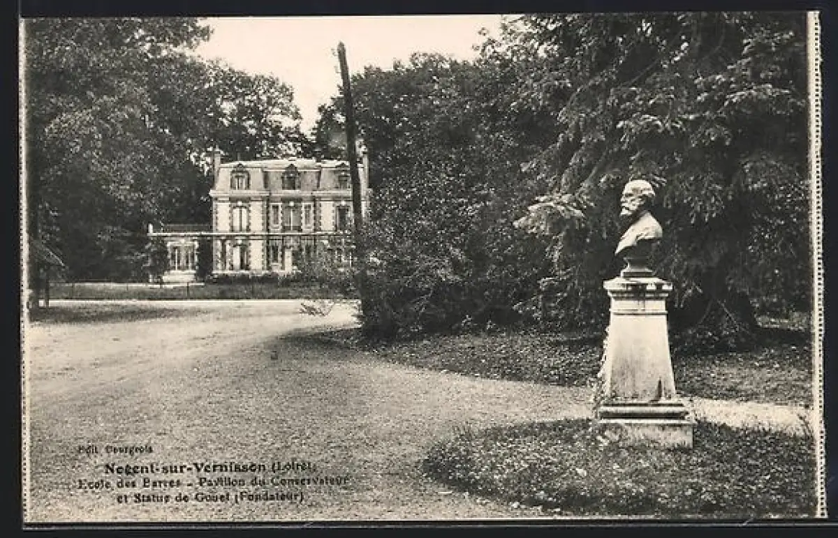 AK Nogent-sur-Vermisson /Loiret, École des Pères, Pavillon du Conservateur et Statue de Gouel, Fondateur