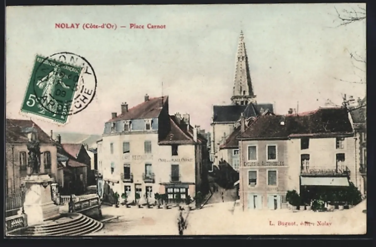 AK Nolay, Place Carnot mit Kirche und umliegenden Gebäuden