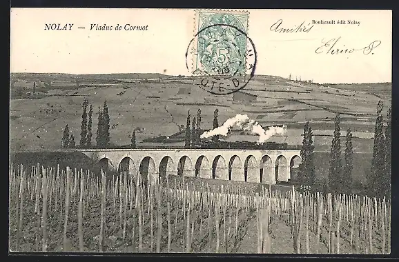 AK Nolay, Viaduc de Cormot avec train à vapeur traversant un paysage champêtre