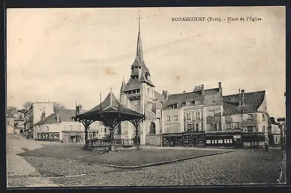 AK Nonancourt, Place de l`Église avec kiosque et bâtiments environnants