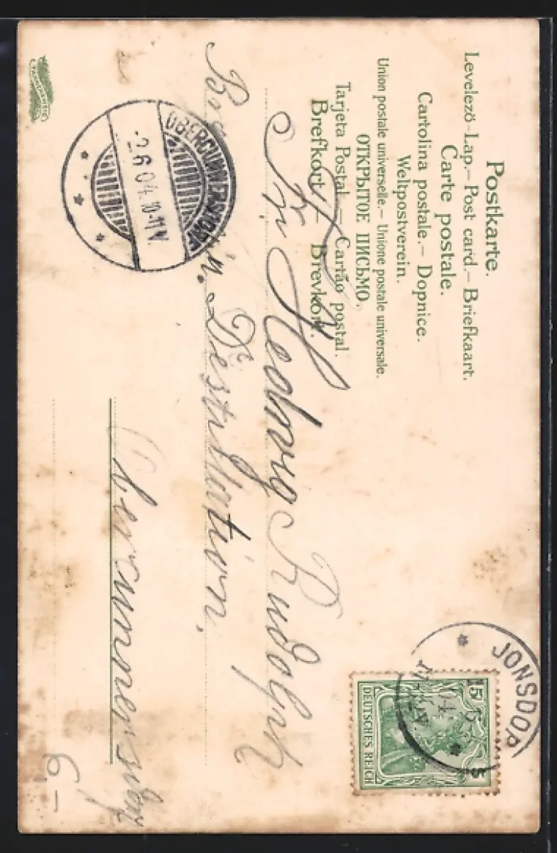 alte Ansichtskarte, gelaufen 1904, Stecknadellöcher re. oben