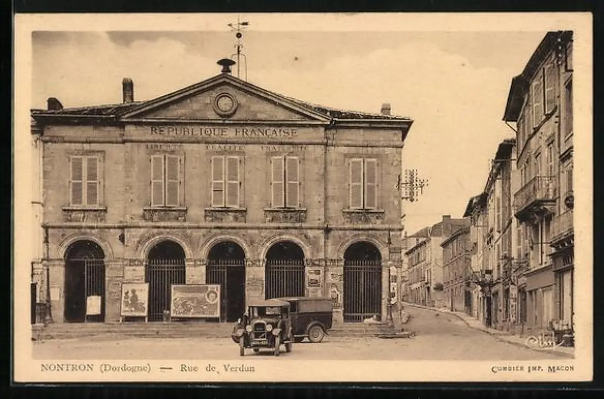 AK Nontron /Dordogne, Rue de Verdun avec bâtiment de la République Francaise et voiture ancienne