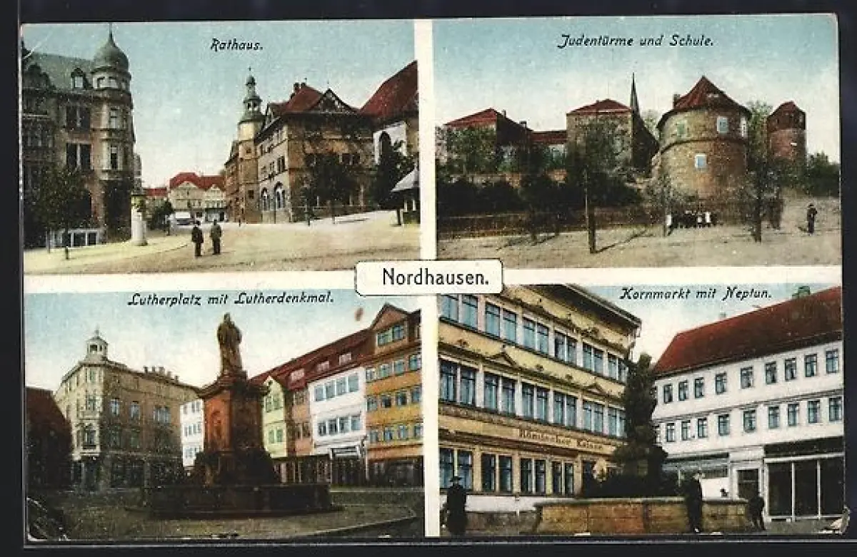 AK Nordhausen, Rathaus, Judentürme und Schule, Lutherplatz mit Lutherdenkmal, Kornmarkt mit Neptun