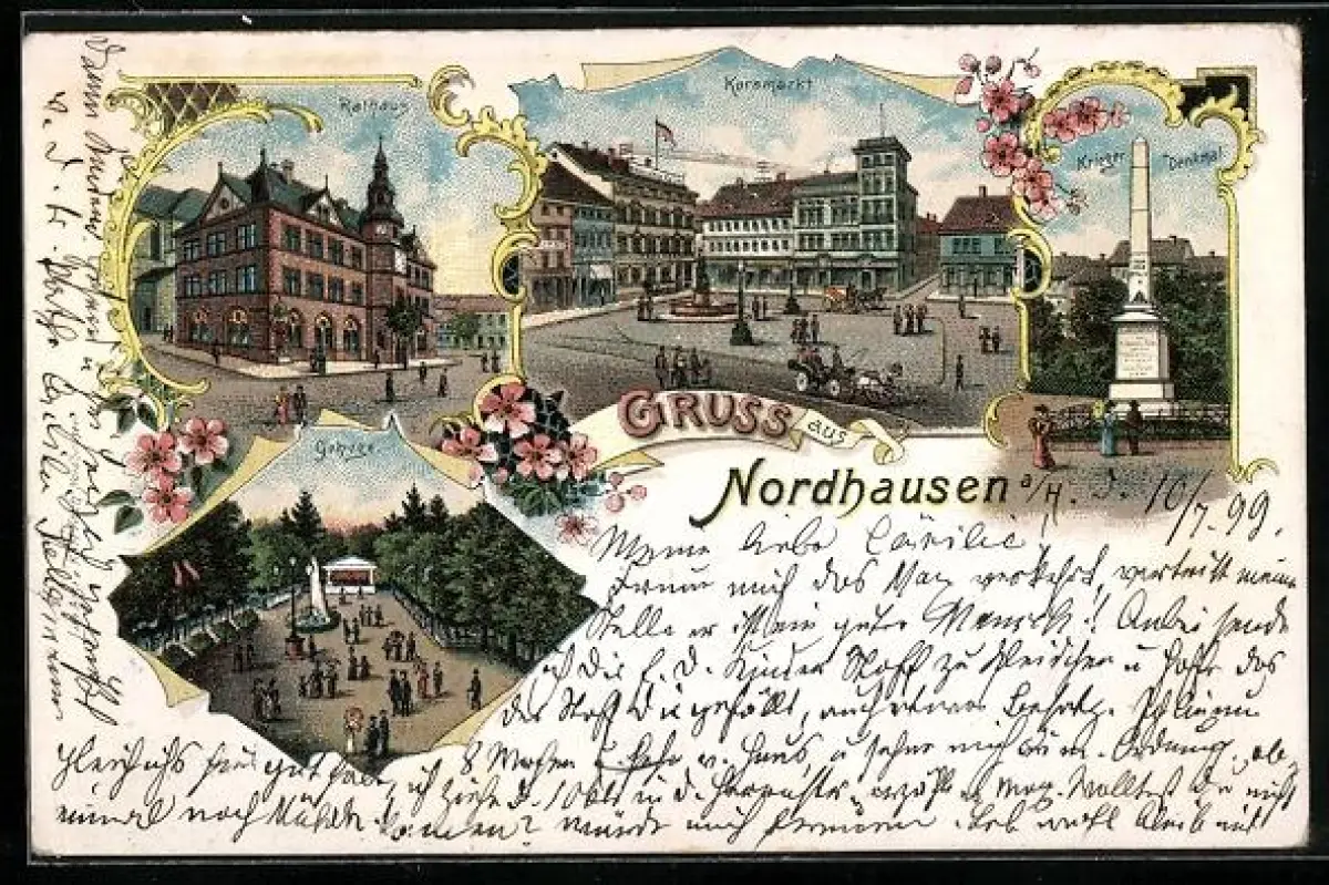 AK Nordhausen a. H., Rathaus, Kornmarkt, Krieger-Denkmal, Gehege