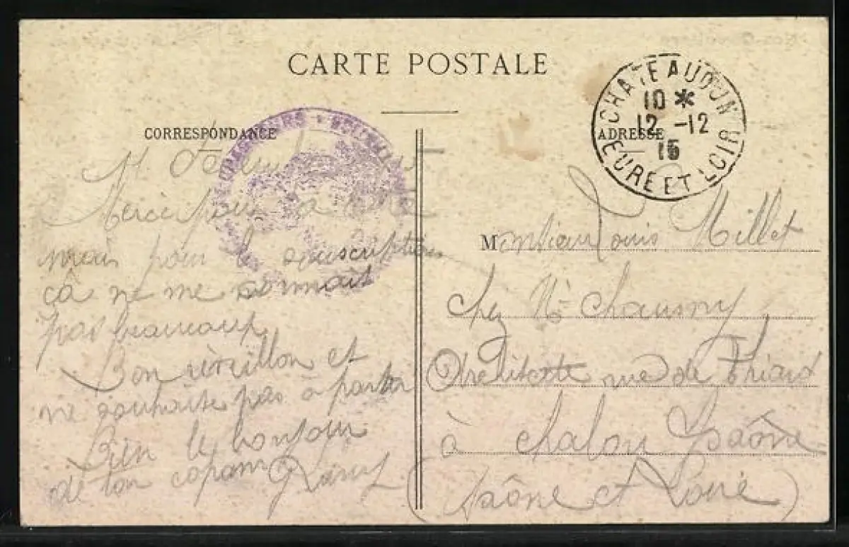Personenbezogene Daten auf der Rückseite der Karte wurden durch blauen Textmarker unkenntlich gemacht. Die blauen Stellen sind auf die Vorderseite durchgeweicht und wirken sich negativ auf das Postkartenfoto aus