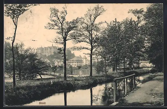 AK Nossen, Partie am Mühlgraben mit Blick auf das Schloss
