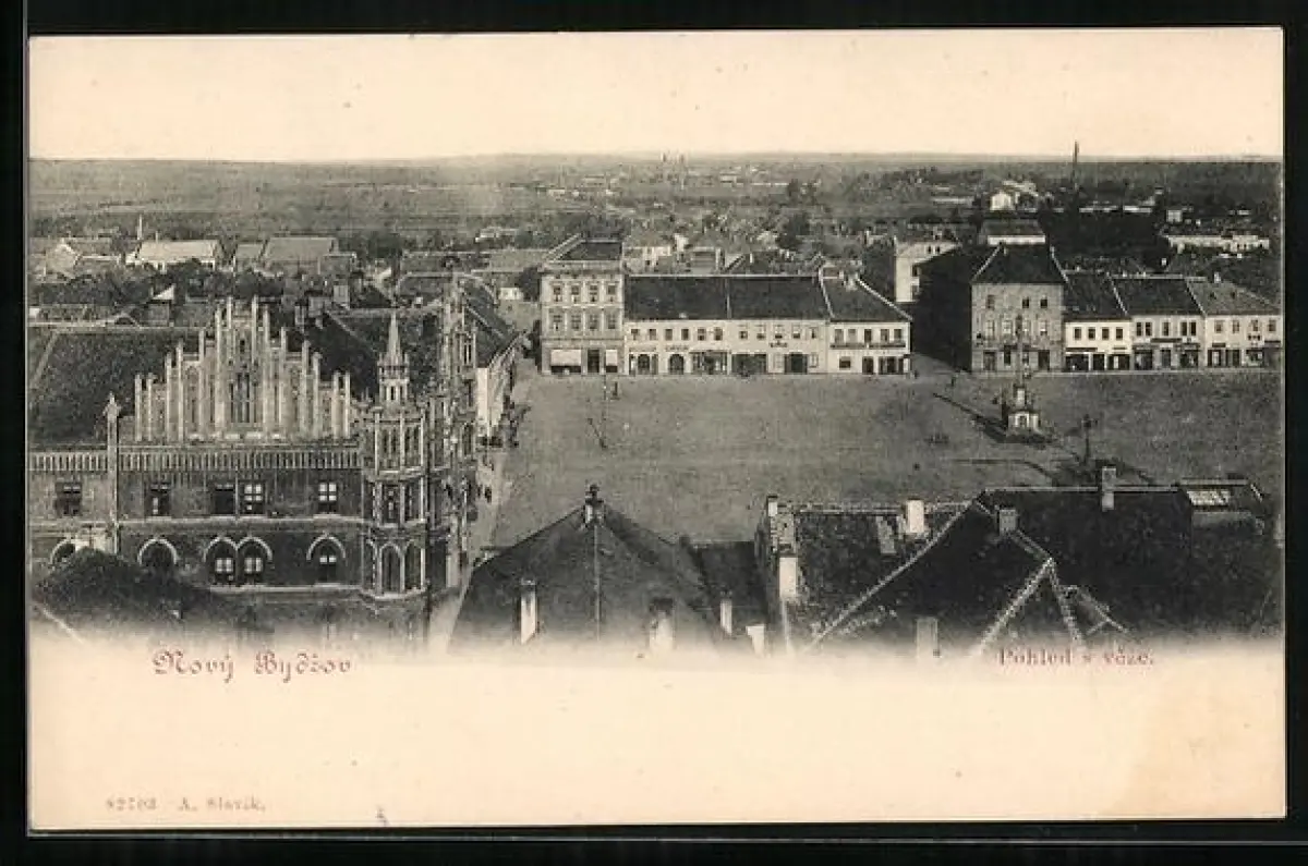 AK Nový Bydzov, Blick vom Rathausturm auf den Platz
