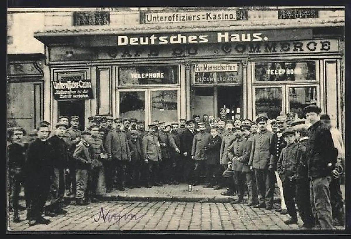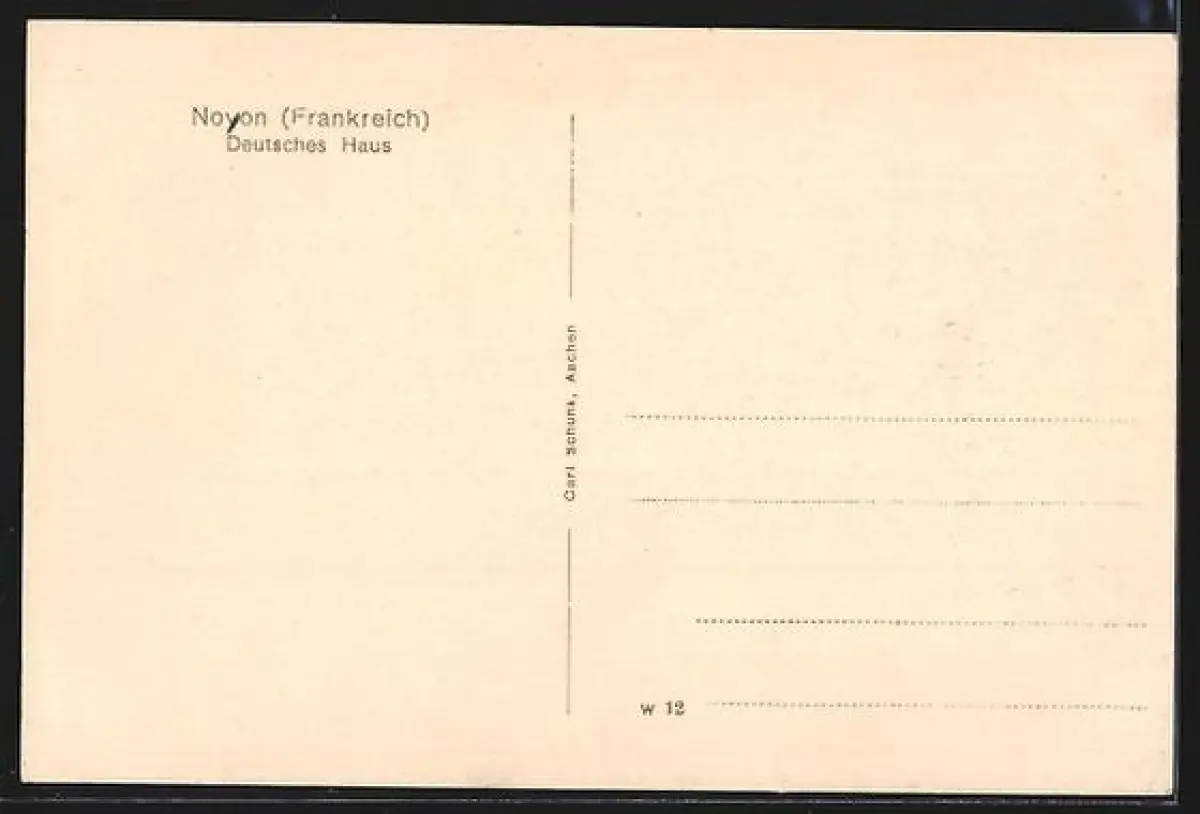AK Noyon, Deutsches Haus avec soldats et civils devant le bâtiment