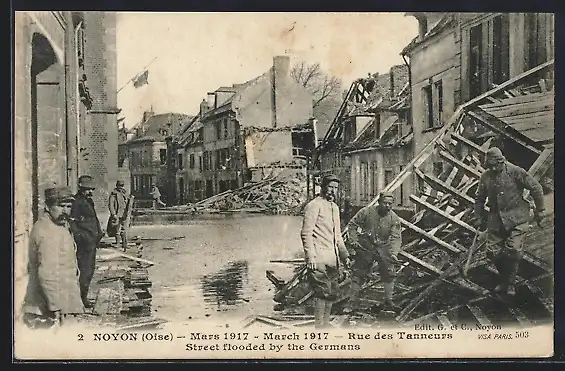 AK Noyon /Oise, Rue des Tannerus, Street flooded by the Germans