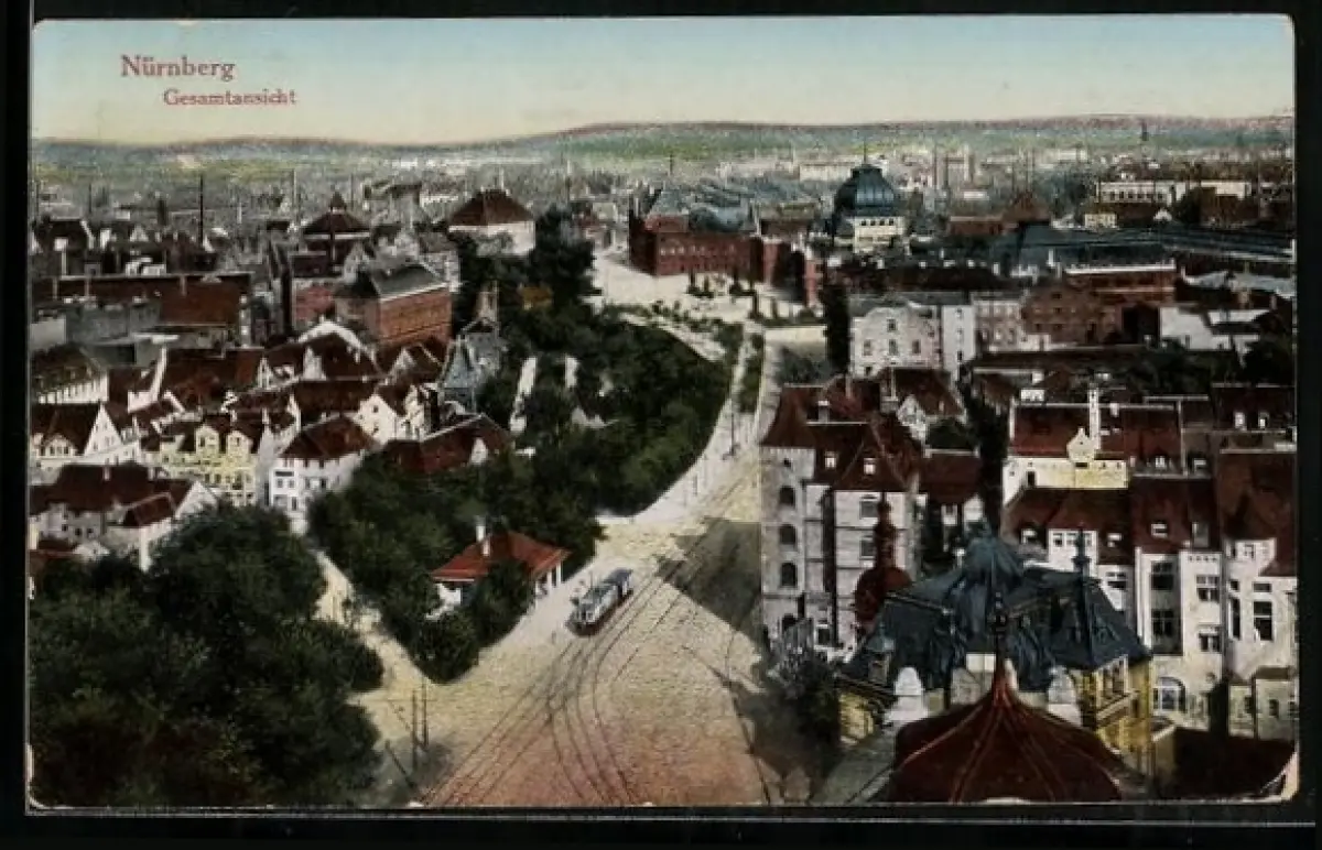 AK Nürnberg, Gesamtansicht mit Strassenbahn aus der Vogelschau