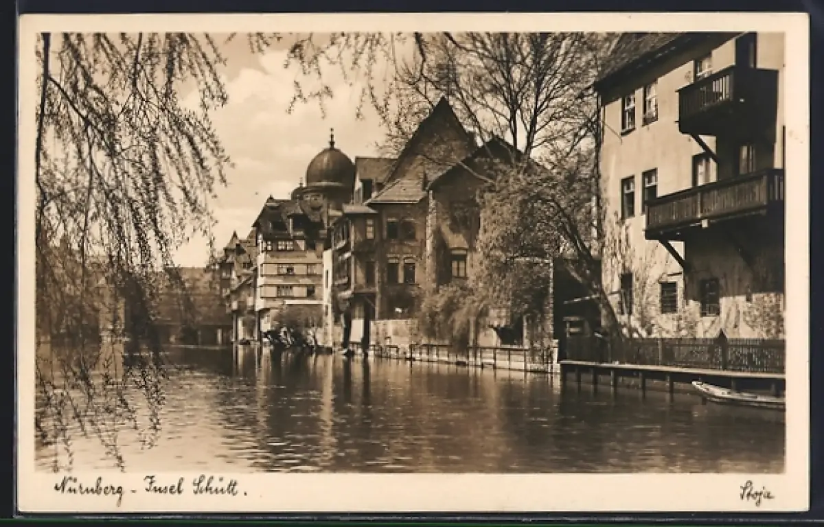 AK Nürnberg, Insel Schütt, Blick auf die Kuppel der Synagoge und die Häuser am Kanalufer