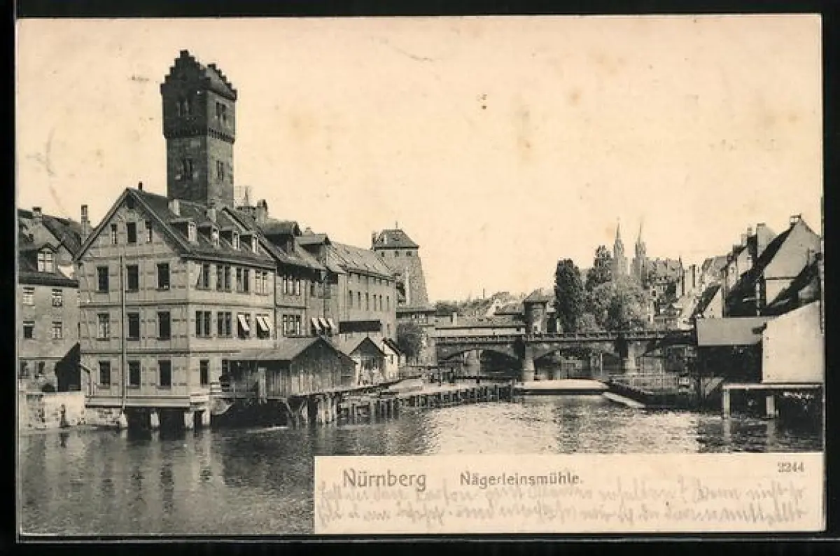 AK Nürnberg, Nägerleinsmühle, Flusspartie mit Brücke