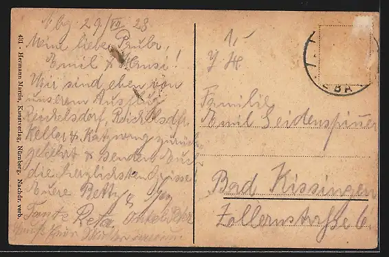 alte Ansichtskarte, gelaufen 1928, Briefmarke entfernt, rückseitig Oberflächenschaden, guter Zustand
