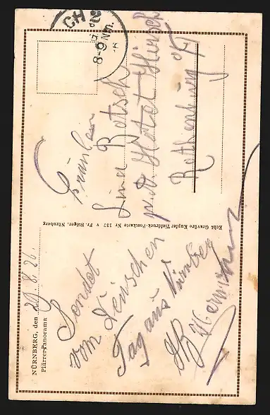 Personenbezogene Daten auf der Rückseite der Karte wurden durch blauen Textmarker unkenntlich gemacht. Die blauen Stellen sind auf die Vorderseite durchgeweicht und wirken sich negativ auf das Postkartenfoto aus