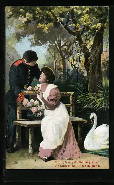 AK O lieb` so lang die Herzen glüh`n, die Rosen pflück`, solang sie blüh`n..., Soldat mit Dienstmädchen