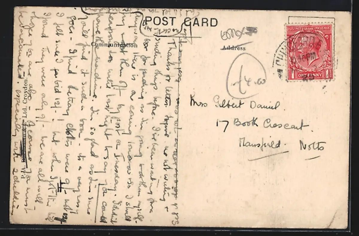 Personenbezogene Daten auf der Rückseite der Karte wurden durch blauen Textmarker unkenntlich gemacht. Die blauen Stellen sind auf die Vorderseite durchgeweicht und wirken sich negativ auf das Postkartenfoto aus