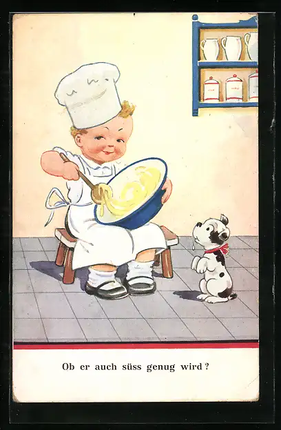 AK Ob er auch süss genug wird?, Kleiner Bäcker rührt Teig