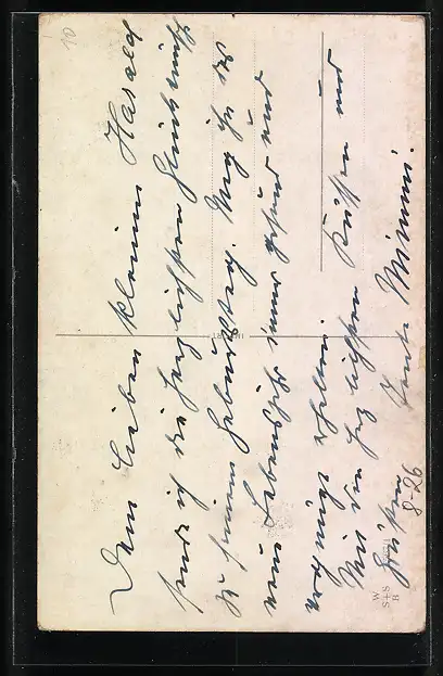 Personenbezogene Daten auf der Rückseite der Karte wurden durch blauen Textmarker unkenntlich gemacht. Die blauen Stellen sind auf die Vorderseite durchgeweicht und wirken sich negativ auf das Postkartenfoto aus