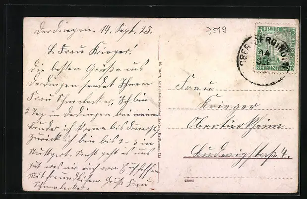 gelaufen 1925, Eckknick re. oben, Bugspur oben, guter Zustand