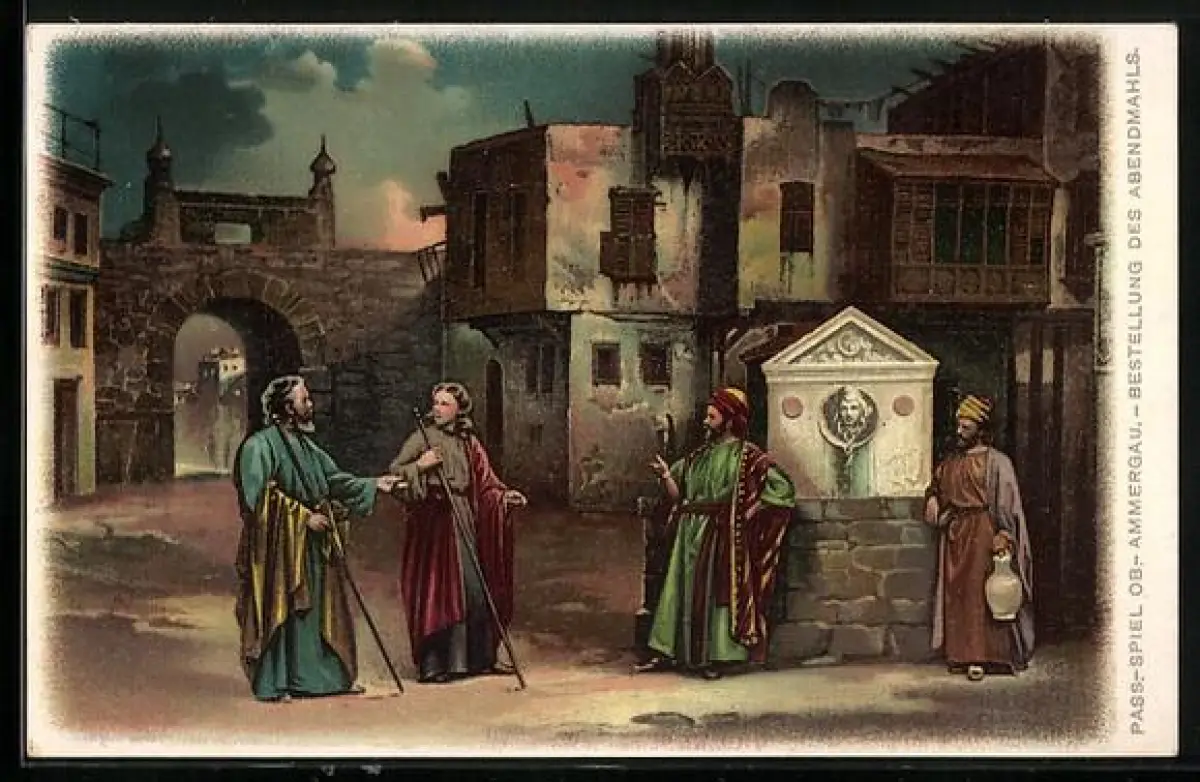 AK Oberammergau, Bestellung des Abendmahls beim Passionsspiel