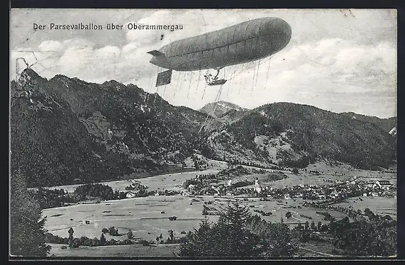 AK Oberammergau, Der Parsevalballon über dem Ort