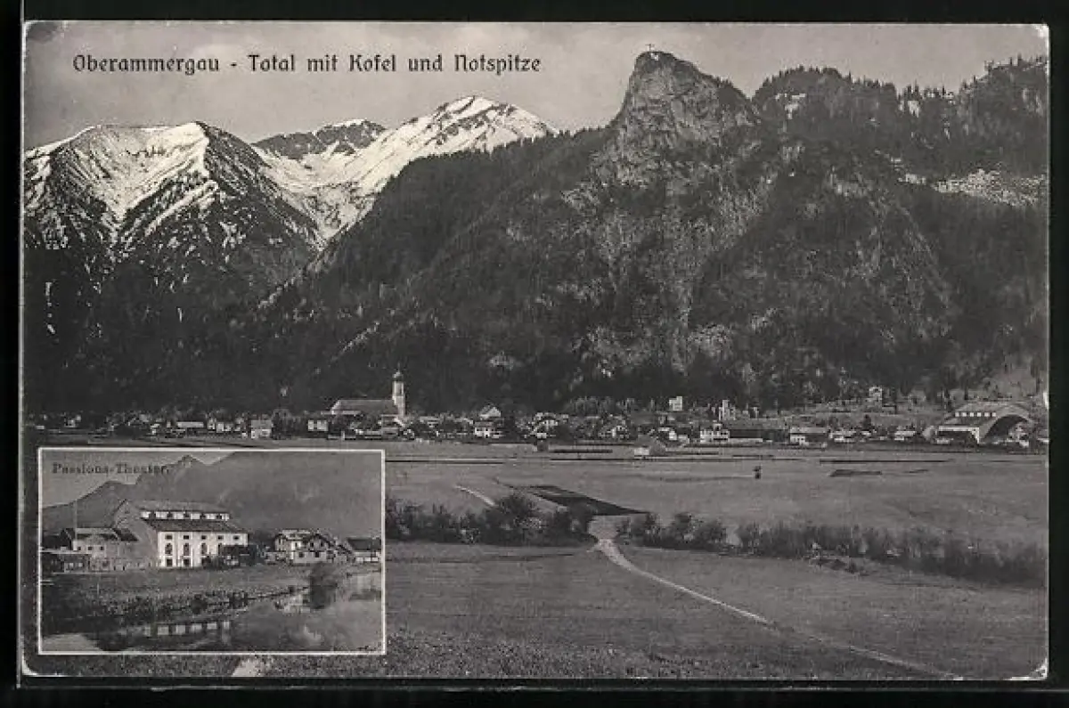 AK Oberammergau, Ortsansicht mit Kofel u. Notspitze, Passionstheater