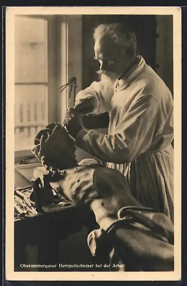 AK Oberammmergau, Herrgottschnitzer bei der Arbeit