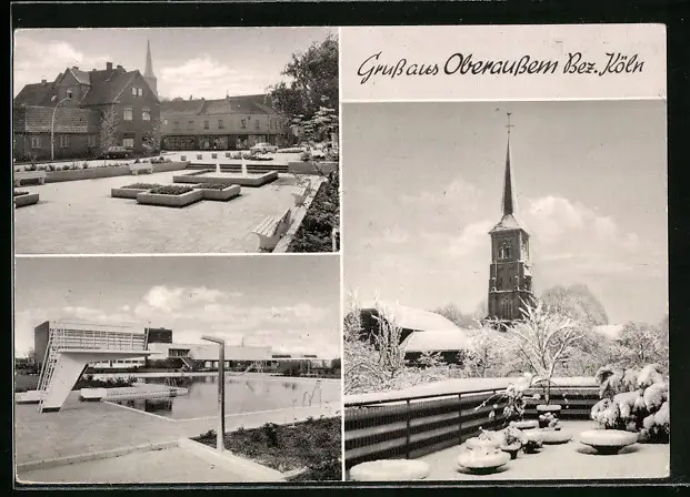 AK Oberaussem /Bez. Köln, Ortspartie mit Kirche im Winter, Ortsansicht mit Grünanlage, Schwimmbad