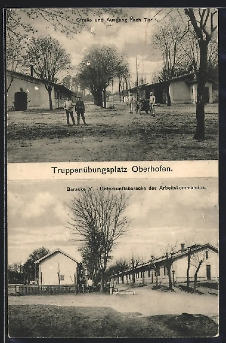 AK Oberhofen, Truppenübungsplatz, Strasse und Ausgang nach Tor 1, Baracke Y, Unterkunftsbaracke des Arbeitskommandos