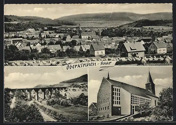AK Oberkirchen /Saar, Viadukt, Kirche, Totalansicht